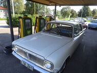Bilar står på kö för att tanka, äldre bilar och ur pumparna kommer