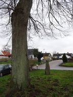 gräsplan med ett högt träd bakom.