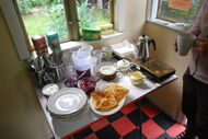 grädde, sylt, och kaffe/te/saft står uppdukat inne i