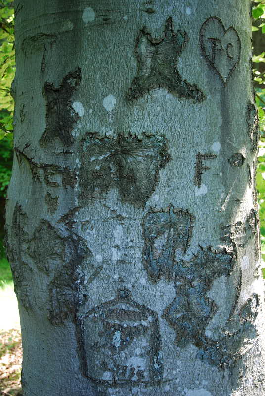 2010-06-05: At the path is a tree trunk with carvings.