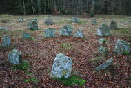 Ekeröds gravfältI skogen väster om E22 vid Ekerödsrasten ligger ett gravfält med sju domarringar. Gravfältet tros vara från yngre järnåldern (400-1000 e.Kr.). 30 december 2011: Jag går av Skåneexpressen 1 vid Ekerödsrasten. Det pågår ett stort vägbygge, skogsvägen jag tänkt gå till gravfältet är helt blockerad. Får gå en omväg och korsa vägbygget, lyckas hitta det som var skogsvägen. Den är helt förstörd, förstärkt som den är för att klara tung trafik till vägbygget. Efter en kort sträcka står en krokig skylt "Gravröse" som pekar in i skogen. Går in cirka 20 meter. På ett krön mot en lövskog ligger ett gravröse. Röset, som är skyltat, är från bronsåldern. I mitten ska en kista finnas som är täckt med sten, runtom en ring med kantstenar. Går vidare på den bedrövligt fula "skogsvägen" till mitt egentliga mål, Ekeröds gravfält. Efter cirka en kilometer ligger en skylt med texten "Gravfält" och pekar upp mot himlen. Där är det inte, jag har varit här förr och vet att det ligger i ekdungen precis söder om vägen. Den består, enligt en skylt, av sju domarringar och några resta stenar. Jag går runt och räknar, 1,2,3,4,5,6, eh ser bara sex, kanske en sjunde otydligt. De tangerar varandra, och delar stenar mellan sig. Ringarna lär vara brandgravar. Finns ett rastbord med grillplats. Det är nog inte många besökare här. I mitt tycke är dessa enklare fornminnen mer intressanta än Ales stenar dit alla ska ta sig. Skåneleden passerar förbi, så vandrare på leden är nog de flesta av besökarna. Långt bort skäller en hund, ett skott smäller. Stenarna är dekorerade med lav och mossa, på murknande fallna trädstammar växer svamp och mossa. Bland träden är några odlingsrösen, från en annan svunnen tid, när man odlade upp de steniga markerna. Svårt att föreställa sig hur livet var. Går tillbaka på vägen. En bil stannar, en kvinna undrar om jag sett en lösspringande hund. "Nä, bara hört hundskall". Skåneleden viker av från vägen, jag följer leden förbi vindskyddet, som ligger vackert vid en låg ås med utsikt över fälten. Går från vindskyddet på leden på en låg ås, över en stätta, genom lövskog tillbaka till vägbygget och Ekerödsrasten där jag ska äta lunch.