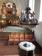 Från samma tid är de rikt snidade predikstolen och dopfunten.