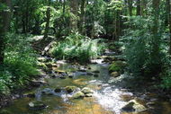 creeks join. A slate wall is by the river. Sit down and rest at the