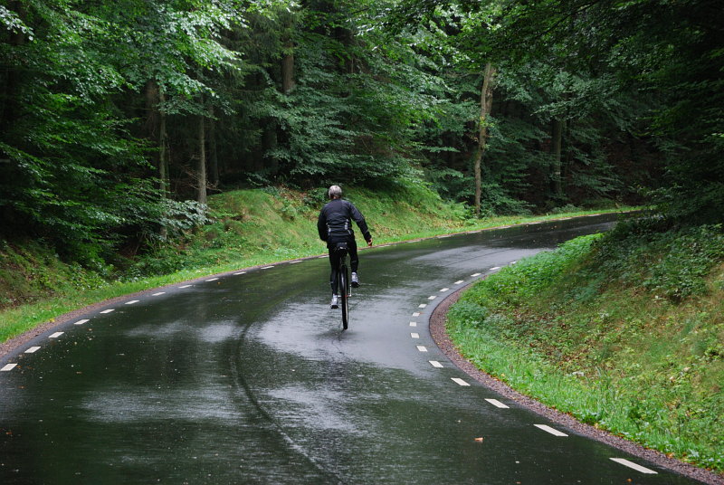 2009-09-13: I närheten är vägen till Höör. Går ut på den. En enhjulscyklist susar förbi.