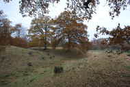 Beritzholmmedieval castle which was demolished in the 1530s. Today, there are mounds and the remains of the moat. Located at Bjärsjölagård. October 31, 2010: Just before Bjärsjölagård castle, when you come from the village Bjärsjölagård, is a sign "Beritzholm" pointing north onto a gravel road. Turn in, set the car in front of the limekilns Adam and Eva. In the past there was a quarry nearby. The ovens are still there, but the building is gone. There is a narrow dirt road to the north. I walk the dirt road past a cattle barn, the cattle guard on the road, which is muddy after rain. It is about a kilometer walk on the dirt road up to the oak grove with the remains of Beritzholm. The area is fenced, a stile leads in. The castle is first mentioned in 1363, and was the seat of often unpopular bailiffs. The castle was stormed by the rebellious peasants, and the castle was demolished in due course. In the 16th century it was used as a quarry to the construction of the Svaneholm castle. The castle was on an islet in a now-drained lake. The islet was divided by a moat in two hills. Throughout runs a moat. In a few places are stones, perhaps the remains of the walls. On the hills are a few depressions. Eat my own picnic sitting on a rock, thinking about how life could have been here. So different from our present. On one side is a forest, with a stile into it. Between the forest and the moat is a kind of plateau. A quiet and somewhat remote spot. I do not think many people find their way here. Go back and drive home. Stop at Sjögården coffee house at the northern part of the lake Vombsjön. Inside is a birthday celebration. I sit down in a corner with coffee and a pastry Margaret. Drive home as dusk falls, it is the standard time again and then early sunset. |