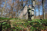 förbi dammen. Bekväm stig i lövskog bland vitsippor.