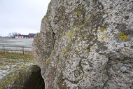 Hofterupsdösenjust east of Hofterups church is a stone chamber tomb from the Neolithic period. February 3, 2013: I park at Hofterups church. I'm not sure it is possible to park at the cairn. So I walk the dirt road there, it is not so far about one kilometer. The dolmen is clearly visible, surrounded by arable land. It is near the road where there is a grassy area where it's probably possible to park. Towards the the road is a wooden barrier, which can be lifted off, and a stile. A sign is trying to tell about the place. As is often the case with these signs has the weather made it unreadable. The dolmen, which is a tomb from the Neolithic period, is in spite of its small scale impressive. Four standing stones, opening to the south, supports a one meter thick roof block. The tomb was originally covered by a mound of earth. To the surrounding farmland is a fence. The roof block must according to my eye measurement to be about two cubicmeter of stone, assuming granite with density 2.7 kg/dm3, it becomes more than a five tonne boulder which is placed up there. On the top of it, there should be carvings. The rocks are slippery with frost, so I do not dare climb up to look after. The roof block also looks out to rest loosely on the side stones, but it is probably an illusion. The dolmen is on a flat elevation, with views in all directions. To the west is visible Hofterup church. Also I appear therefore widely. A bit west is a pond with protective shrubbery, I go there to do what is necessary. The crop is patiently waiting for spring. It takes a while, the ground is frozen and the cold lingers. I'm leaving. On the way home, I stop at the Little Blue bakery and café in the Blue House in Löddeköpinge and buy some cookies to have together with coffee at home. |
